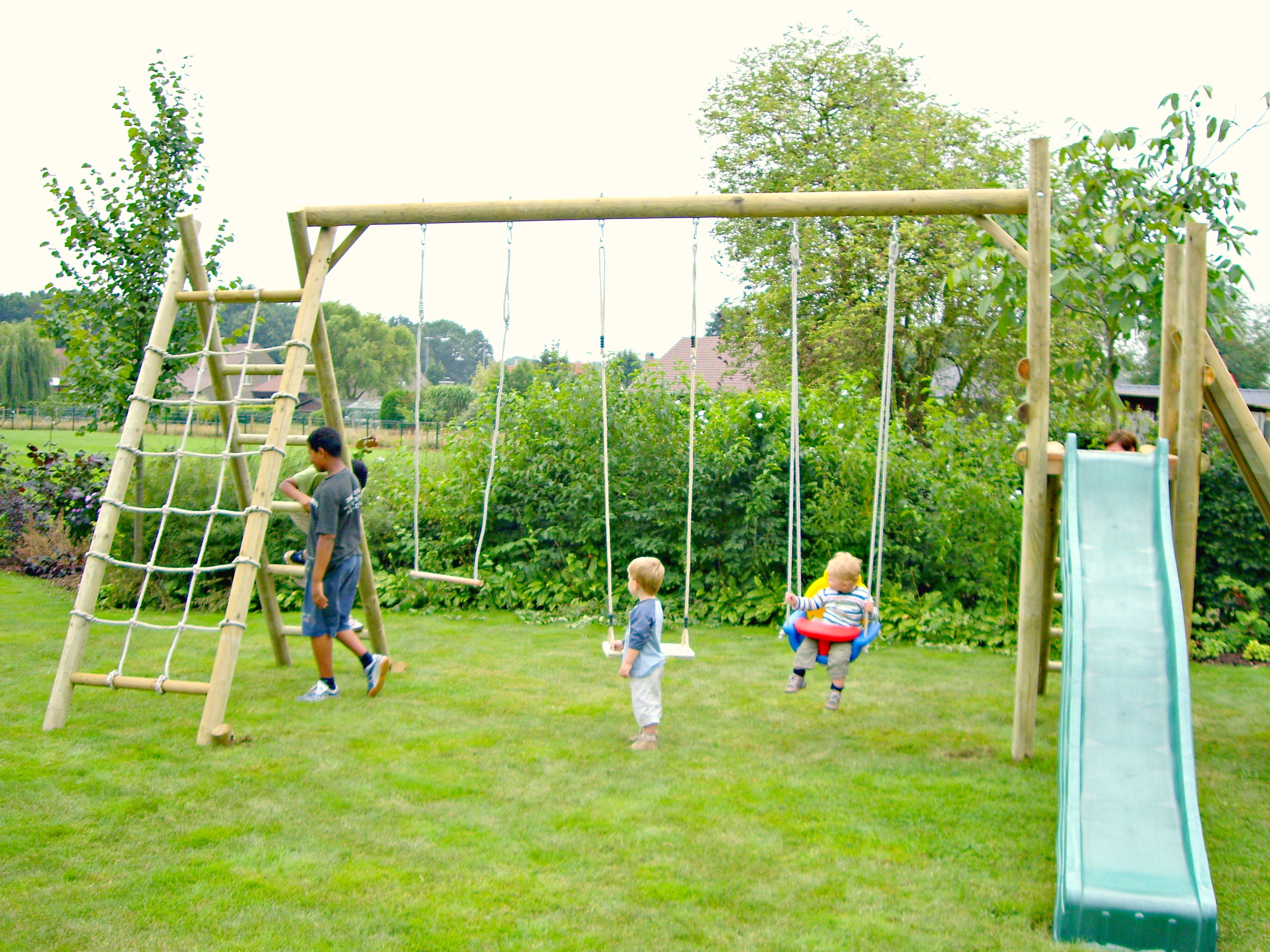 Wij bieden een ruime keuze aan speeltuigen gaande van een eenvoudige, alleenstaande houten schommel tot complexe speeltuigen waar u kunt op klimmen, schommelen en vanaf kunt glijden of een speeltuig dat lijkt op een echte woning met een aangebouwd terras.